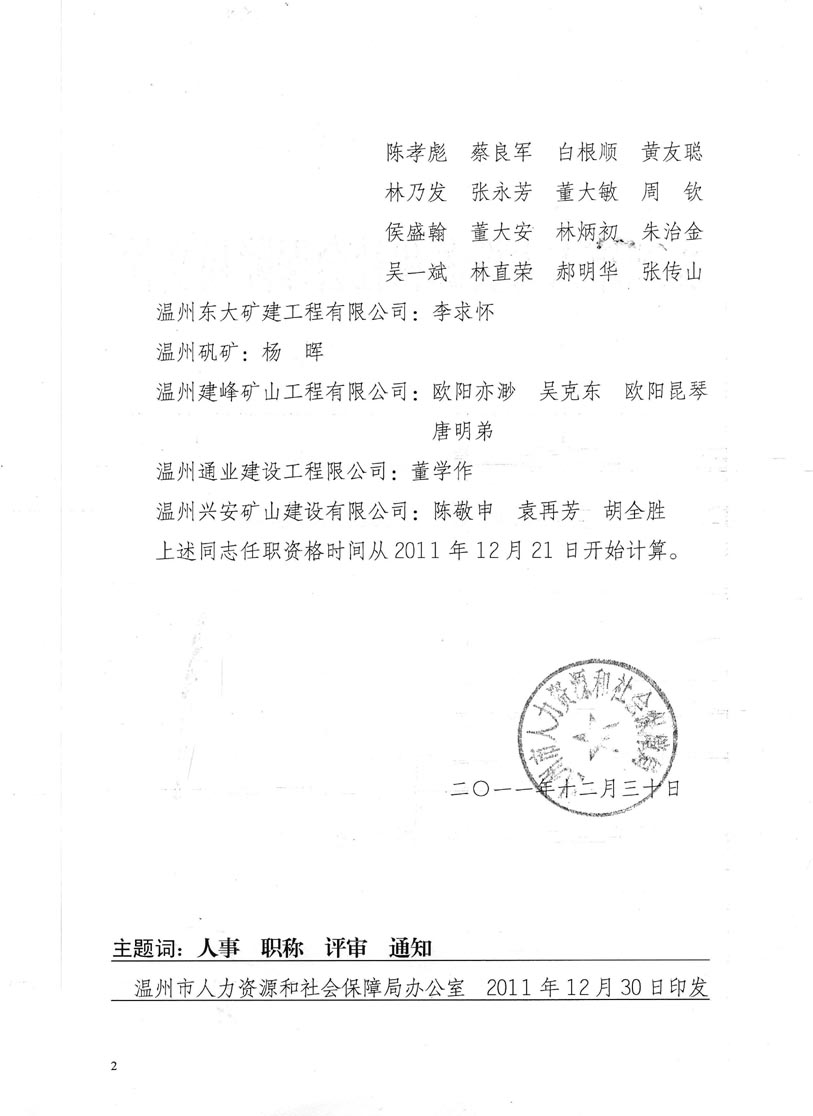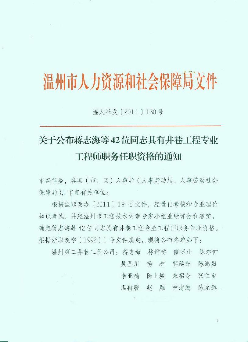 關(guān)于公布蔣志海等42位同志具有井巷工程專業(yè)工程師職務(wù)任職資格的通知
